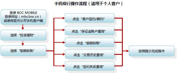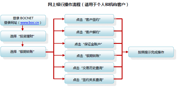 第二步:請(qǐng)您按照我行網(wǎng)銀BOCNET個(gè)人服務(wù)申請(qǐng)受理流程申請(qǐng)我行BOCNET理財(cái)版?zhèn)€人服務(wù),開通網(wǎng)銀服務(wù)后,您可登錄我行網(wǎng)銀系統(tǒng)自助開通投資服務(wù),選擇銀期轉(zhuǎn)賬——簽約,并在線確認(rèn)簽署《中國(guó)銀行銀期轉(zhuǎn)賬服務(wù)協(xié)議書》(個(gè)人投資者網(wǎng)銀適用),開通銀期轉(zhuǎn)賬服務(wù)。